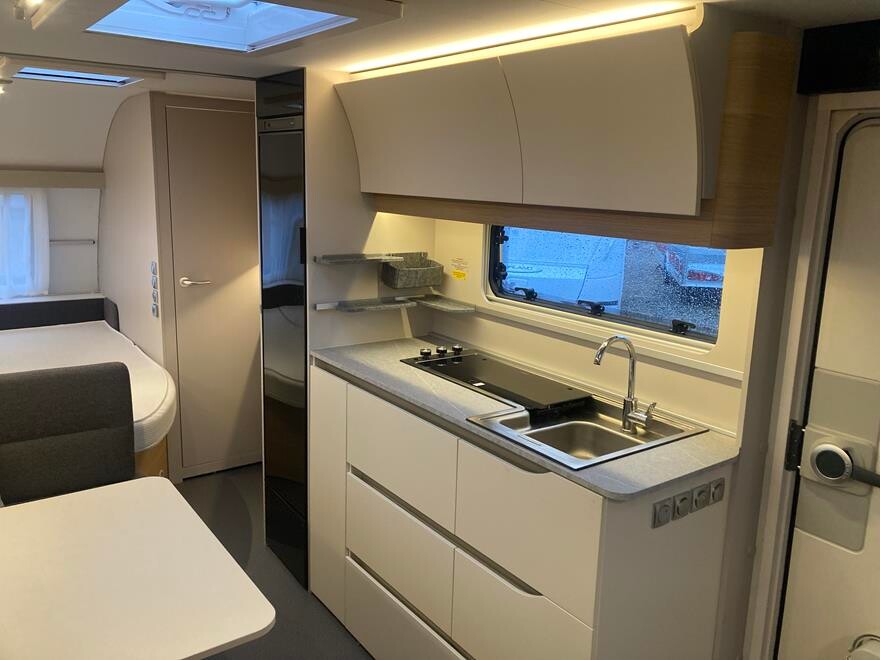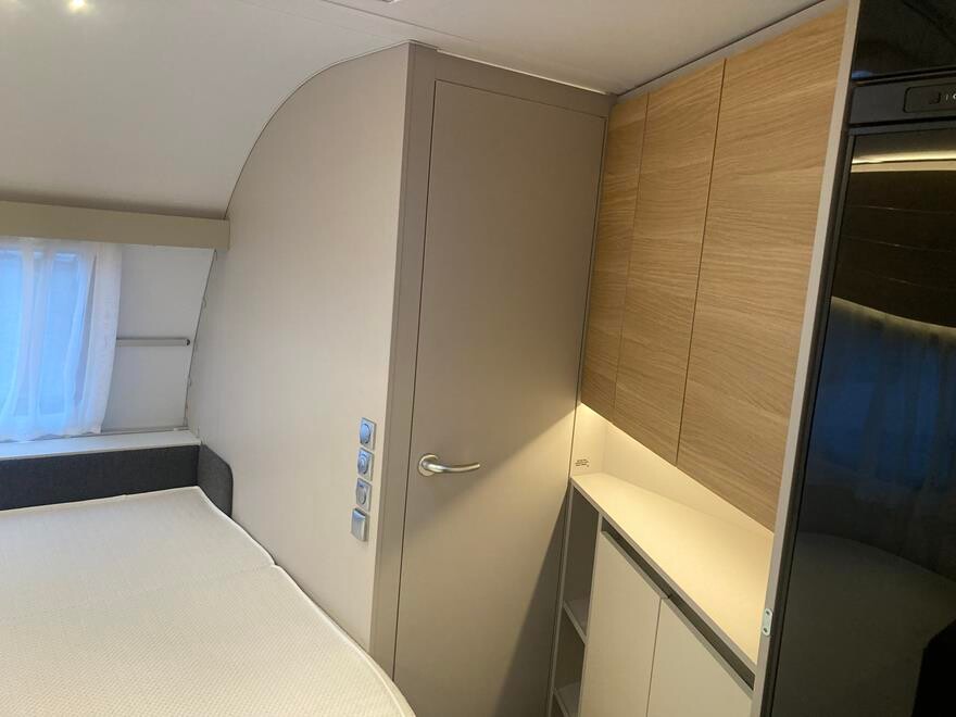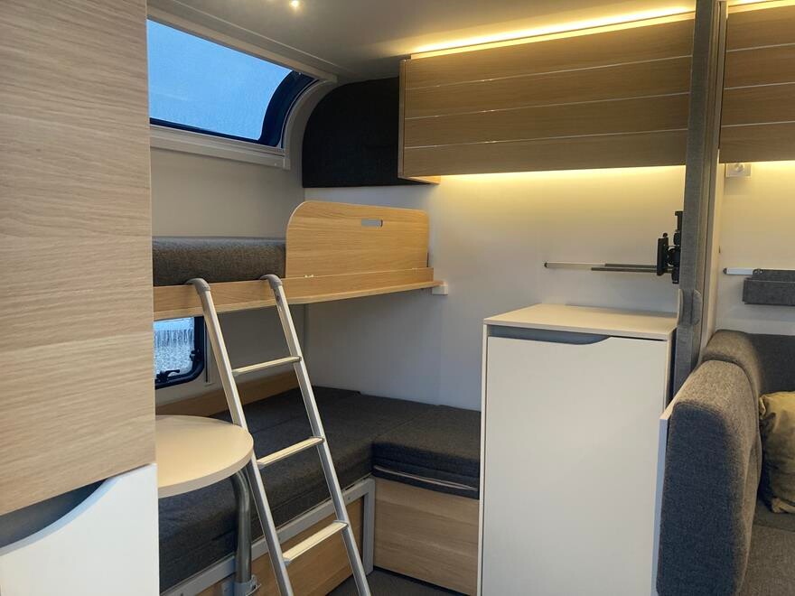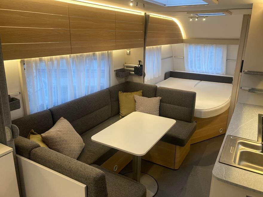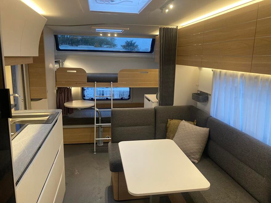 Flot og velholdt køjevogn fra Adria fra 2021 Vognen er indrettet med køjer i bagenden hvor der er mulighed for at klappe køjen ned og lave en stor seng, Dernæst finder du en hyggelig rundsiddegruppe med god plads til familien, Overfor dette er køkken med stort slimline køleskab, Forrest i vognen er en god fransk dobbeltseng, samt klædeskabe og toiletrum med klapvask og bruser. Der kommer masser af lys ind i vognen via den flotte panorama bagrude. Vognen er udstyret med en Truma XT mover og et Isabella Commodore Dawn fortelt. Velkommen indenfor i denne flotte køjevogn.