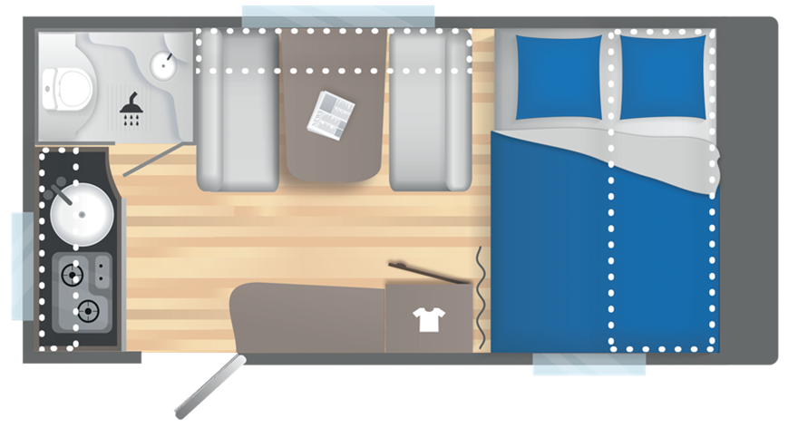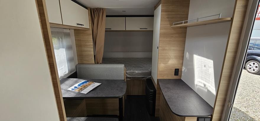 EFTERÅRSTILBUD SPAR 11995.- Få denne vogn leveret incl. Enduro EM 313 manuel mover og kpl 12 volt anlæg mont for 4.995.- ( Normal pris 16.994 .- ) —————————————————– Super let vogn til to og med en egenvægt på lige under 1000 kg. Vognen er indrettet med køkken og badeværelse i bagenden. Herefter siddegruppe og i forenden soveafdeling med tværvendt dobbeltseng. Vognen er en kampagne model inkl. Truma 3004 varmeovn, Safety pakke og brusepakke.