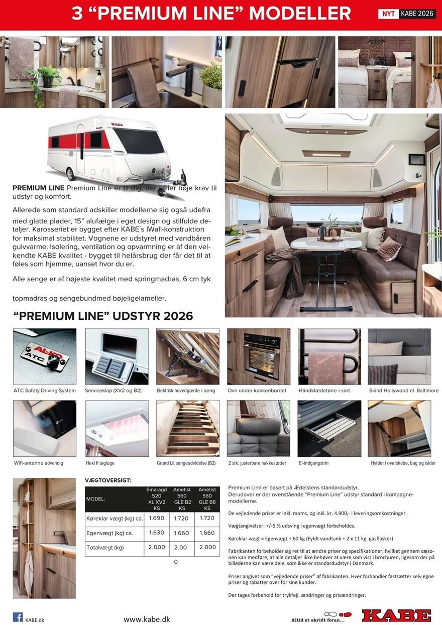 OBS !!! Kommende vogn. Produceres december 2025 Kabe Ametist Premuim Line 560 GLE KS – 2026 Denne flotte kabe er udstyret med stor rundsidegruppe i forenden og enkeltsenge i bagenden. Toilettet er placeret midt i vognen, I midten af vognen er også køkken med stort køleskab og masser af opbevaringsplads. Vognen er udstyret med Alde centralvarme, vandbåren gulvvarme fra Alde, ferskvandstank, spildevandstank, Alko Atc trailerkontrol, skindpolster, lameludtræk m.m..