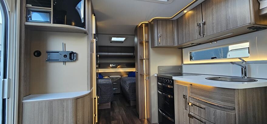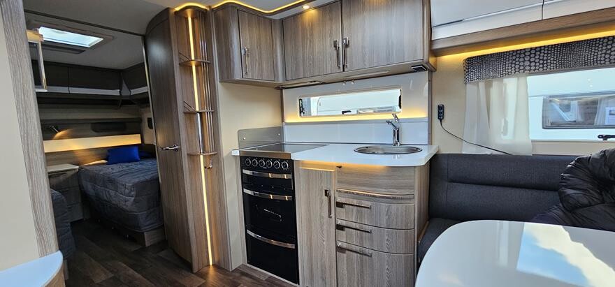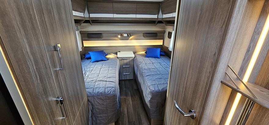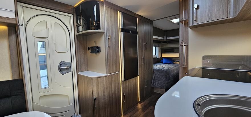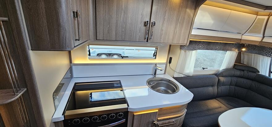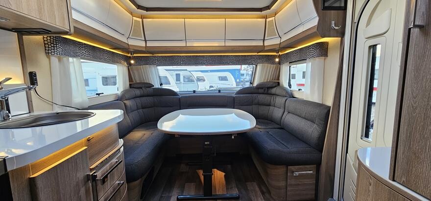 Kabe Royal 600 GLE – 2019 Stor rummelig vintervogn med dejlig rundsiddegruppe i forenden. Herefter Køkken med komfur, gasbageovn og emhætte samt stort køleskab midt i vognen. I bagenden soveafdeling med 2 enkeltsenge i bagenden. Ekstraudstyr: Truma XT caravan mover.